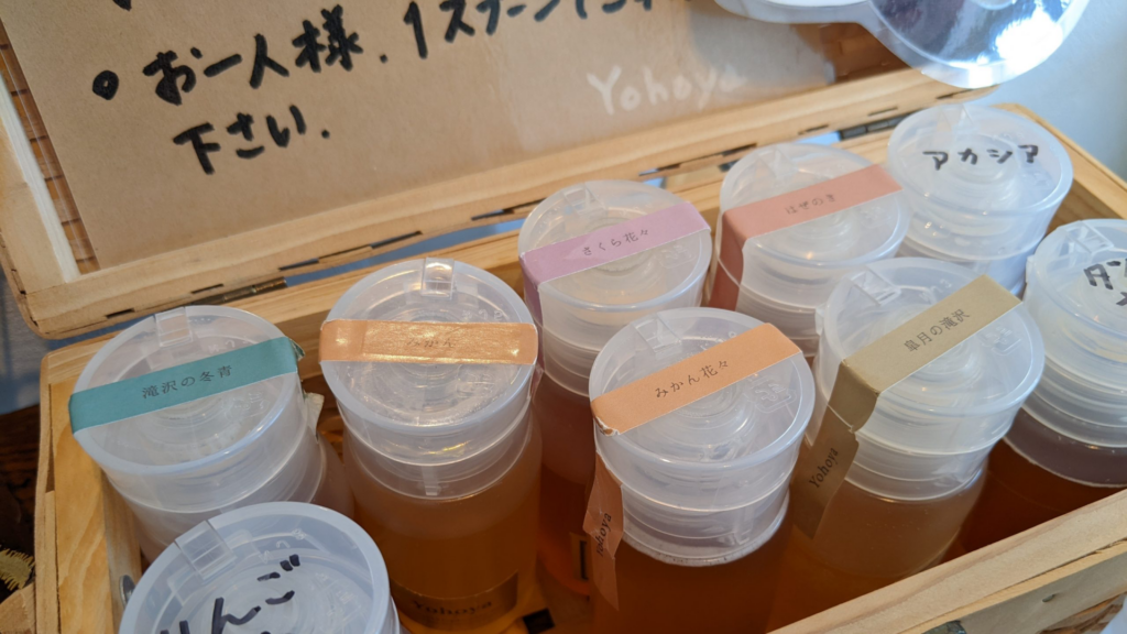 スーパーなどで購入するはちみつは、いろいろな花の蜜が混ざった「百花蜜」が大半ですが、養紡屋では一種類の花の蜜だけを集めた「単花蜜」をメインで販売されています。花ごとに色も香りも味も全く違うため、試食コーナーで味を比べながら好みのものを選んでください。