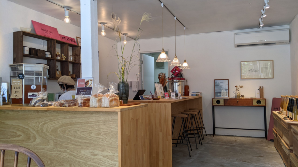 木の質感に溢れた店内はまるでおしゃれなカフェスタンド!店内手前にはちみつが、店内奥にはミードの瓶が並びます。