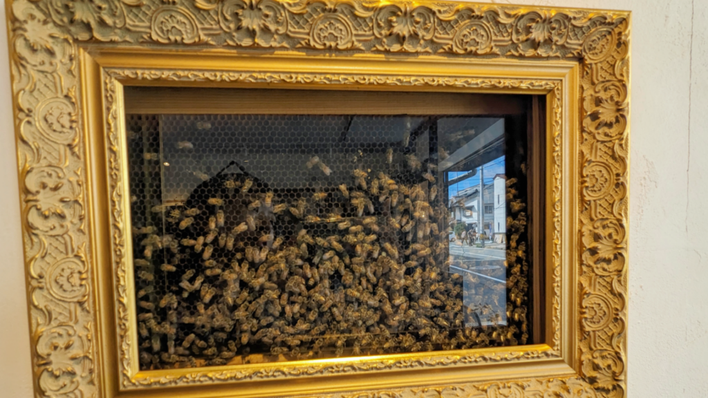養紡屋の店内を見て回っていると、1額縁が目に止まり、釘付けに。それがこちらなのですが、生きた働き蜂達の仕事風景を観察できるライブ型インテリア。